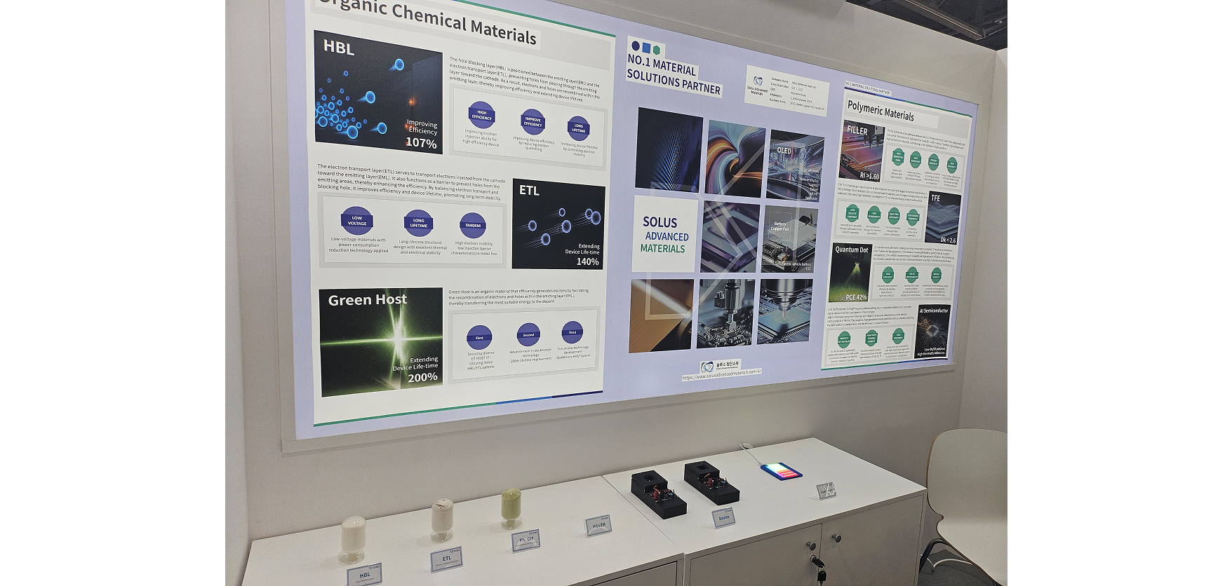 展会上,索路思高新材料面向全球行业人士,展示了OLED显示器用有机化学材料及其他高分子材料等核心产品,